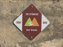 Concludo con alcune considerazioni sulla segnaletica. Fino a Macugnaga, il percorso della Strà Granda è siglato B00, ma su alcuni cartelli indicatori e su alcune cartine si trova la sigla B0. La segnaletica verticale è costituita da cartelli che, tuttavia, mancano in alcuni punti in cui sarebbero necessari (solo in alcuni casi sono sostituiti da altre indicazioni). La segnaletica orizzontale è costituita dai classici segnavia a due strisce bianche e rosse. Però la presenza di tali segnavia è un po’ discontinua: ci sono tratti in cui sono frequenti, in altri sono davvero pochi o addirittura mancanti. Talvolta sono sostituiti da frecce (in genere di colore rosa) dipinte soprattutto per terra nei tratti col fondo asfaltato o in cemento. La Strà Granda ha anche un suo logo (vedi la foto), che però è presente assai raramente e non può essere considerato un utile segnavia (spesso è vicino ai cartelli o ai segnavia bianco/rossi e quindi serve più che altro a ricordarci che stiamo percorrendo una “via storica”).