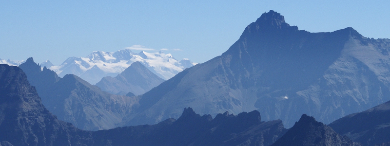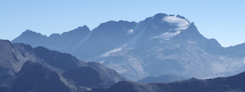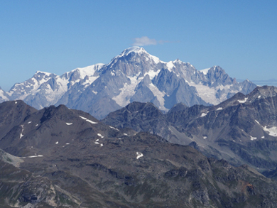 | Verso Sud-Ovest, la vista si sofferma sulle montagne francesi della Vanoise, dominate in particolare dalla Grande Motte (3653 m) e dalla Grande Casse (3855 m), che vediamo riprese col teleobiettivo nella foto a destra. | |