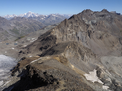 | In questa pagina vediamo immagini panoramiche riprese dalla vetta. Nella foto a sinistra, verso Nord, possiamo ammirare la cresta della Becca (in primo piano), seguita dalla Punta Bassac Deré (3352 m), dalla Punta Bassac Sud (3462 m) e dalla Grande Traversière (3496 m). A sinistra di queste montagne, sullo sfondo, compare il Monte Bianco. Nella foto a destra vediamo il Ghiacciaio di Gliairetta con la Grande e la Petite Sassière. | |