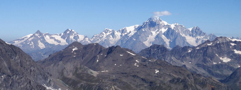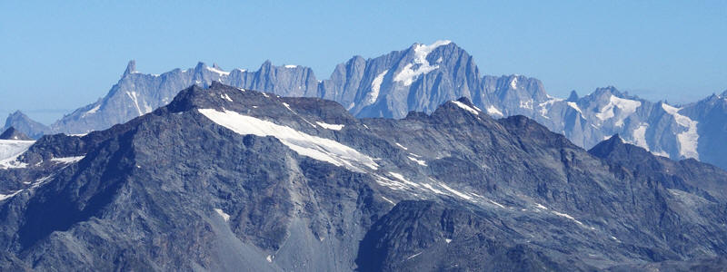 | In secondo piano, da destra, vediamo la Punta Bianca della Grivola (3793 m), la Grivola (l'ardua Grivola bella di Carducci; 3969 m) e, spostato tutto a sinistra, il Grand Nomenon (3488 m). In fondo si vede il gruppo del Monte Rosa (da sinistra: Polluce, 4091 m, Castore, 4223 m, Lyskamm occidentale, 4479 m, Lyskamm orientale 4527 m, Punta Zumstein, 4563 m, Punta Gnifetti, 4554 m, Punta Parrot, 4432 m, e Piramide Vincent, 4215 m). | |