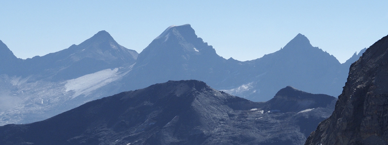 | Ancora un'immagine del gruppo del Gran Paradiso. Da sinistra a destra: Colle del Gran Paradiso (3335 m), Tresenta (3609 m), Ciarforon (3642 m) e Becca di Monciair (3544 m). | |
