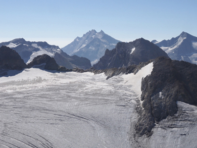 | Il settore sud-occidentale del massiccio del Monte Bianco. Da sinistra a destra si vedono: l'Aiguille des Glaciers (3816 m), le Aiguilles de Trélatête (3930 m la punta più alta), l'Aiguille de Bionassay (4052 m), il Monte Bianco (4810 m), il Mont Maudit (4465 m) e il Mont Blanc de Tacul (4248 m). Sotto la cima del Monte Bianco si vedono bene i tre ghiacciai del Brouillard (a sinistra), del Freney (al centro) e della Brenva (a destra). | |