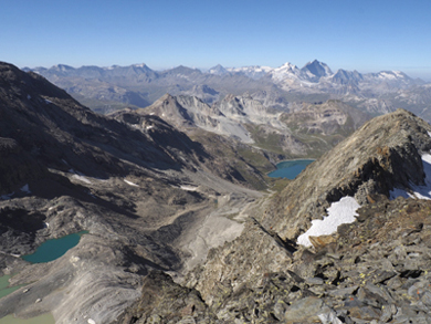 | In queste due ultime foto vediamo le due valli italiane all'incontro delle quali si trova la Becca della Traversière. A sinistra vediamo la Valle di Rhêmes con, in primo piano, il Ghiacciaio di Goletta e l'omonimo lago, presso il quale passa il sentiero che dal Rifugio Benevolo sale al Col Bassac Deré. A destra vediamo invece la Valgrisenche, con la parte alta dell'itinerario descritto nella relazione: si vedono due dei tre laghetti morenici presso cui si transita e, subito sopra, la balconata erbosa a quota 2820 m circa. | |