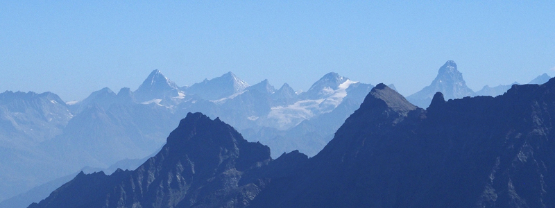 | Oltre la catena che divide la Valle di Rhêmes dalla Valsavarenche si alzano il Cervino (4478 m; a destra, inconfondibile) e altri grandi cime delle Alpi Pennine (quella a sinistra dovrebbe essere la Dent Blanche, 4357 m; le altre non riesco a individuarle). In primo piano vediamo, da sinistra, la Punta di Ran (3272 m) e la Punta Bioula (3414 m). | |