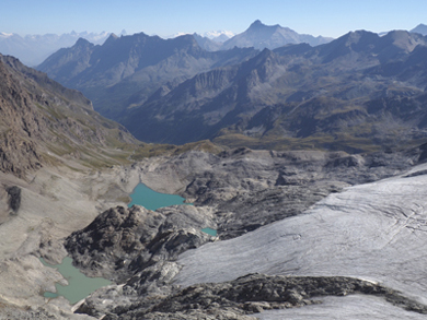 | A sinistra: il Ghiacciaio di Goletta con, sulla destra, il Picco di Goletta (3245 m). Sullo sfondo, al centro della foto, vediamo il gruppo delle Levanne (3619 m la punta più alta) e, sulla destra, la Grande Aiguille Rousse (3482 m). Nella foto a destra vediamo ancora una parte del Ghiacciaio di Goletta e, sulla destra, la caratteristica mole della Tsanteleina (3601 m), con la parete Nord, un tempo interamente coperta di ghiaccio. | |