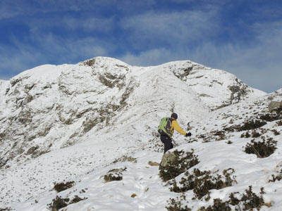 Salendo da Corte Lagoni verso la Bocchetta di Revolte. Proprio sopra il mio compagno si vede l'ampia cresta erbosa (per l'occasione innevata) che porta alla spalla posta al limite orientale della cresta sommitale. La cima del Pizzo Camoghé non è l'elevazione che appare più alta, ma il dosso completamente nevoso alla sua sinistra (l'elevazione più alta è l'anticima). |