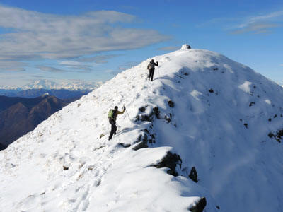 Gli ultimi passi prima della cima (si vede bene il grosso ometto posto sulla sommità). Sullo sfondo, sulla sinistra della foto, si ammira il Monte Rosa. Nella foto successiva, ripresa dalla cima, si può notare che le nostre tracce non percorrono il sentiero che aggira l'anticima sul versante settentrionale per raggiungere i ruderi della capanna, ma si tengono sul filo della cresta. E' stata una scelta dettata dalla presenza di molta neve sul versante Nord. Il percorso della cresta presenta qualche passo su facili roccette, reso un po' più impegnativo dalla presenza della neve (la difficoltà è superiore a quella dell'itinerario descritto nella relazione ed è valutabile EE, sempre senza neve). |