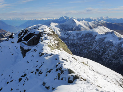 Uno sguardo verso Ovest dalla cima. Si vedono i ruderi della capanna posta sotto l'anticima. L'edificio era stato costruito dall'esercito svizzero durante la prima guerra mondiale. Dal 1945 al 1972 è stato utilizzato come rifugio dal CAS Ticino. Nel 1984 la costruzione è stata distrutta da un incendio e non più ricostruita. Nelle vicinanze si trova una cappella commemorativa. In primo piano si vedono, coperte di neve, le lastre rocciose inclinate a Sud che impongono un po' di attenzione. Sullo sfondo, contro il cielo al centro della foto, si vede il Monte Legnone (sotto il quale si nota la bella piramide del Pizzo di Gino). A sinistra, nella parte alta della foto, si osserva il solco della Valtellina. |