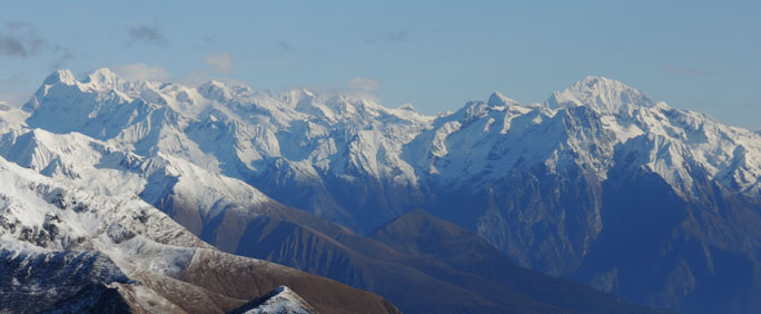 Ecco una prima immagine panoramica presa dalla cima, verso Est. Si possono ammirare le montagne del Masino-Bregaglia e del gruppo del Disgrazia. In particolare, a sinistra si distinguono il Pizzo Badile (3308 m) e il Pizzo Cengalo (3369 m), mentre a destra spicca la mole del Monte Disgrazia (3678 m). |