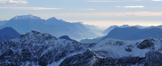 Guardando verso Sud-Ovest ecco apparire uno scorcio del Lago di Como circondato da montagne assai popolari: a sinistra la Grigna Settentrionale (2410 m), la Grigna Meridionale (2177 m), dietro cui si scorge il Resegone (1875 m); a destra il Monte Moregallo (1276 m) e i caratteristici Corni di Canzo (1373 m), sotto i quali si delineano i Monti di Tremezzo. In primo piano si vedono la Vetta del Vallone (2135 m) e il Monte Segor (2097 m), tra l'italiana Val Cavargna e la Svizzera. |