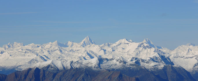 Verso Nord-Ovest lo sguardo arriva ad ammirare le montagne dell'Oberland, tra cui spicca (messa in risalto dall'uso del teleobiettivo) la bellissima piramide del Finsteraarhorn (4274 m). |