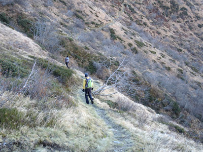 Percorrendo il traverso lungo il versante settentrionale del Monte Garzirola. In condizioni normali il sentiero non presenta alcun problema, anche quando percorre tratti ben più ripidi di quello visibile nella foto (in questi casi basta solo un po' di attenzione). |
