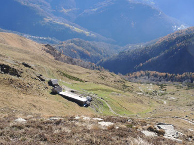 Dalla cresta nei pressi del Passo di Pozzaiolo guardando verso la Val Colla si vedono innanzitutto gli edifici dell'Alpe di Pietrarossa (1549 m), davanti ai quali passa l'ampio sentiero che collega la Capanna San Lucio e la Capanna Monte Bar. Sulla destra della foto, sotto questo sentiero, si vedono anche i tornanti della stradina che sale dai Barchi. A sinistra, invece, si vede il lungo costone erboso (quello percorso dalla variante descritta al termine della relazione) che scende fino al fondo della Val Collla (sul costone si trovano anche le case di Barchi e il paesino di Colla, che però non si vedono nella foto). |