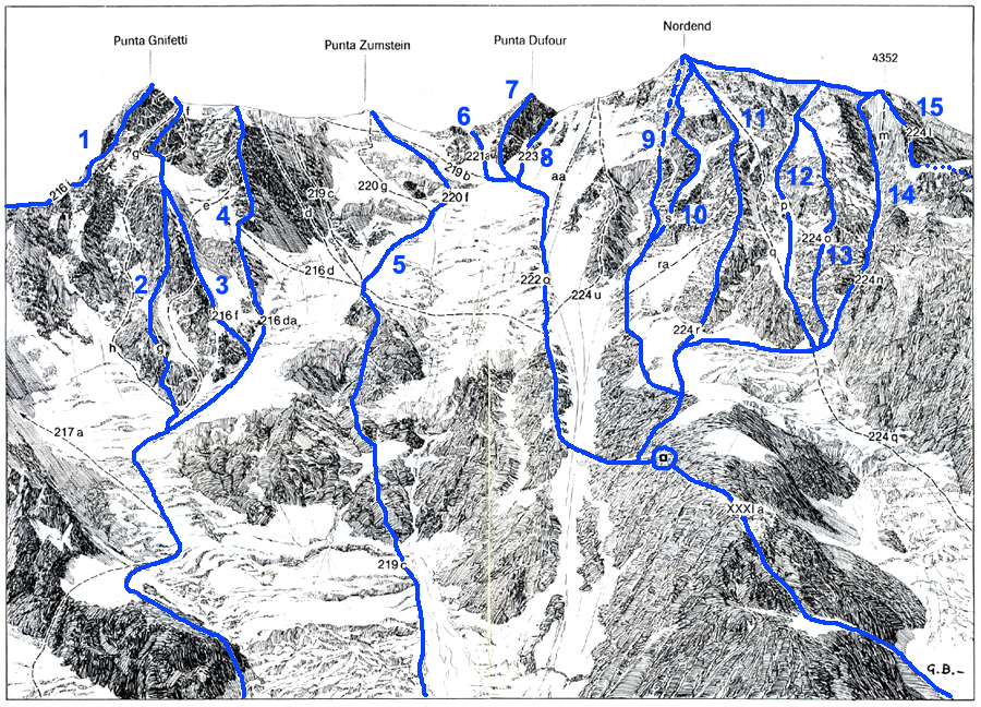 PAERETE EST. LE VIE INVERNALI. 1. Cresta Signal, marzo 1948; 2. Via del Centenario, gennaio 1976; 3. Via dei Francesi, febbraio 1965; 4. Nervatura di destra, marzo 1977; 5. Punta Zumstein, Via Del Custode-Zani, dicembre 1972; 6. Colle Zumstein, gennaio 1981; 7. Punta Dufour, via Imseng, febbraio 1965; 8. Silbersattel, marzo 1953; 9. Via Ranzoni-Jacchini, gennaio 1989; 10. Via Restelli, gennaio 1993; 11. Via Brioschi, febbraio 1967; 12. Canalone sinuoso, febbraio 1984; 13. Cresta del Poeta, gennaio 1976; 14. Canalone della Solitudine, febbraio 1971; 15. Cresta di Santa Caterina, febbraio 1967. O = Capanna Marinelli. Non ho segnato la Via Francesca Schranz alla Nordend (inverno 1993) perché non ho trovato alcuno schizzo della via ( aggiornamento 12/2023). |