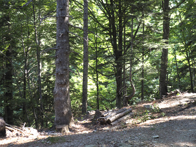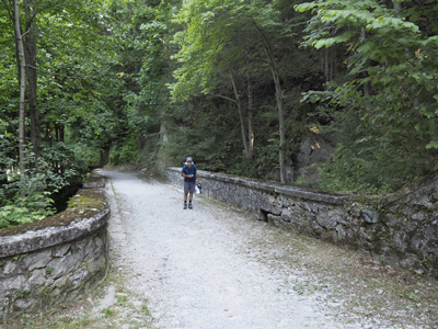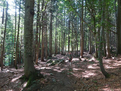 All'inizio della tappa e del giro si percorre per un breve tratto la sterrata che, immersa in un bel bosco misto di conifere e latifoglie, entra nel Vallone del Saut o del Salto (foto a sinistra); la salita prosegue poi lungo un buon sentiero che sale, sempre nel bosco, fino al Pian del Creus (foto a destra). |