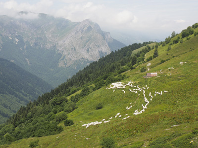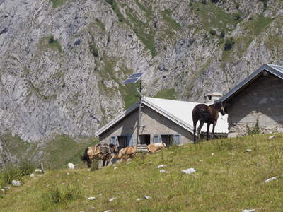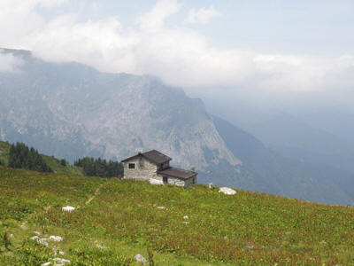 Nella foto a sinistra: il Gias della Costa con la sua mandria di vacche. Proprio sopra la baita si nota, contro il cielo, il dosso di quota 1714. Sullo sfondo vediamo ancora la Punta Mirauda e la Punta Labiaia Mirauda. A destra: la grande baita del Gias soprano di Sestrera (1847 m). |