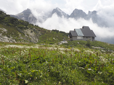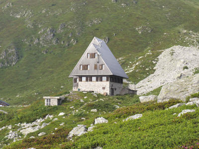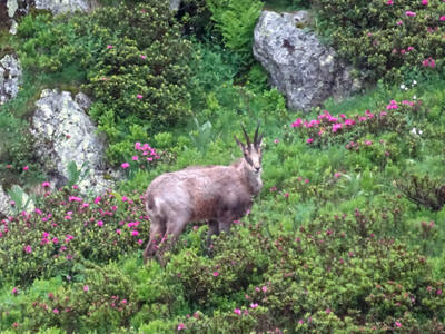 A sinistra: un camoscio fotografato verso sera col teleobiettivo dal terrazzo del Rifugio Garelli. A destra: l'originale struttura del rifugio (il progettista si è ispirato al profilo del Marguareis e del suo gruppo, come ben si vede nell'altra foto che ritrae la costruzione). |