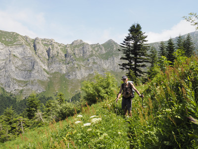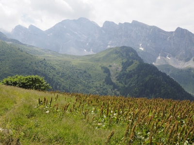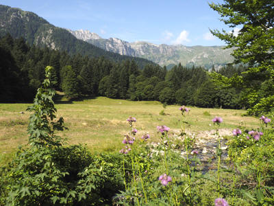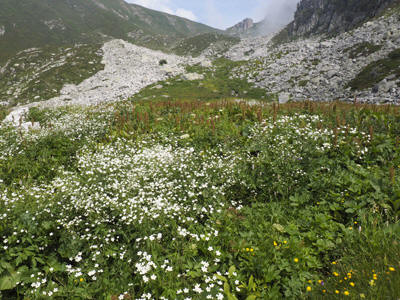 A sinistra: il Pian del Lupo e il Rifugio Garelli (1966 m) sullo sfondo del Marguareis. A destra: la bella fioritura del Pian del Lupo sullo sfondo del Vallone di Sestrera, lungo il quale si svolge il primo tratto della seconda tappa, fino alla Porta Sestrera (visibile contro il cielo). Presso il Pian del Lupo si trova la Stazione botanica "Clarence Biknell", uno dei due giardini-riserva della biodiversità del Parco Naturale del Marguareis l'altra (intitolata a Danilo Re), si trova presso il Laghetto del Marguareis (1924 m), a 20 minuti di cammino dal Rifugio Garelli. |