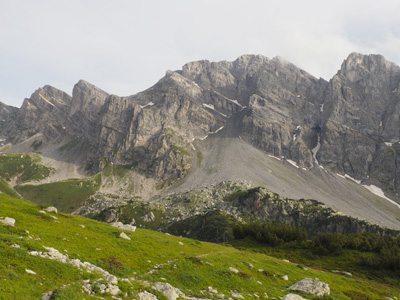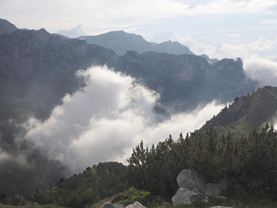 Nella foto a sinistra, scattata dai pressi del rifugio, vediamo (da sinistra a destra) la Cima Bozano, la Cima Pareto, la vetta del Marguareis, la Punta Pino Prato (appena sulla destra della cima più alta), e la Cima Armusso. Sulla destra: le nubi risalgono il Vallone del Marguareis (sullo sfondo, contro il cielo, vediamo ancora la Cima della Fascia). |