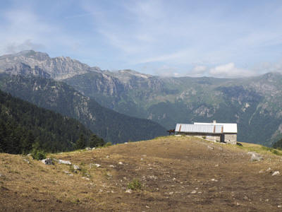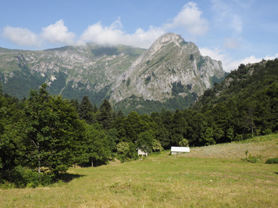 A sinistra: giunti sul dosso panoramico di quota 1714 m possiamo ammirare per la prima volta il versante settentrionale del Marguareis (2652 m; la cima più alta nella fotografia) e delle cime che lo affiancano: a sinistra Cima Bozano (2565 m) e Cima Pareto (2538 m); a destra Punta Tino Prato (2573 m), Cima Armusso (2526 m), Castello delle Aquile (2513 m) e, più staccata verso il margine destro della foto, Cima Scarason (2355 m). A destra: la piccola baita del Gias della Costa (1709 m). |