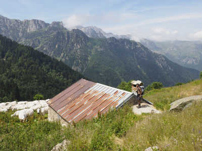 Le baite del Gias Pian del Creus (1290 m) sullo sfondo della Punta Labiaia Mirauda (1971 m; a destra) e della Punta Mirauda (2155 m; a sinistra). Il sentiero non tocca le due baite, che si trovano sulla destra idrografica del piccolo torrente scavalcato dal ponticello di legno: le si vede voltandosi indietro e guardando verso Ovest-Nord-Ovest (foto a sinistra). Nella foto a destra: le belle baite del Gias Madonna (1652 m), posto in posizione molto panoramica nell'alto Vallone di Serpentera. Sullo sfondo, sulla sinistra, si nota ancora la Cima della Fascia. Nella parlata locale il termine "gias" indica l'alpeggio. |