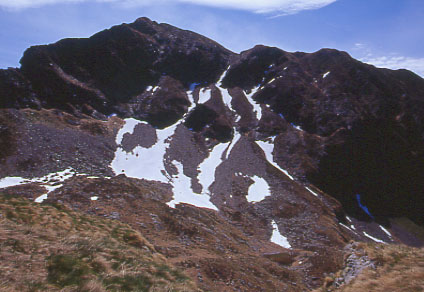 Il versante occidentale del Monte Capio visto dall'itinerario di discesa. A destra della cima si nota bene la bocchetta da cui parte il canalino attrezzato, anch'esso ben visibile nella foto perché in gran parte innevato (dalla bocchetta scende verso sinistra). Sulla sinistra della foto si vede anche la conca con grossi massi che si raggiunge dopo aver sceso il canalino. |
