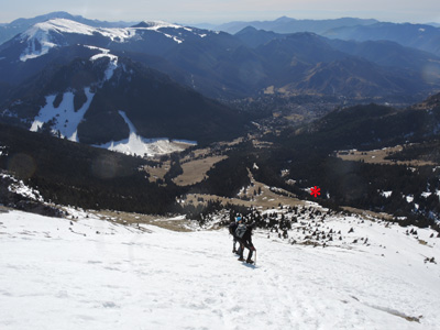 In primo piano vediamo la lunga dorsale Sud-Est del Monte Visolo, lungo la quale si svolge la prima parte della discesa. Procedendo verso il fondo si notano i prati e i boschi che si attraversano durante l'avvicinamento, quindi le piste del Passo della Presolana e poi quelle del Monte Pora. Sulla destra, più in fondo, si vede il Lago d'Iseo, mentre a sinistra, si nota il solco della Val Camonica. |