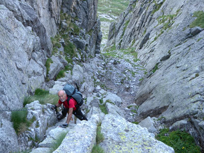 Nella foto a sinistra vediamo l'imponente Monte (o Pizzo) di Zocca (3175 m) illuminato dai primi raggi del sole; in evidenza, tra l'ampio versante Est-Nord-Est e l'articolata parete Sud-Ovest, si ammira il lungo spigolo Sud-Est, alla cui base passa il Sentiero Roma poco prima di giungere al Rifugio Allievi (terza tappa). A destra vediamo un passaggio lungo il canale che dal Passo di Val Torrone si abbassa nell'omonima valle. Il canale non è difficile, ma presenta qualche tratto attrezzato che va affrontato, come sempre, con la dovuta attenzione. |