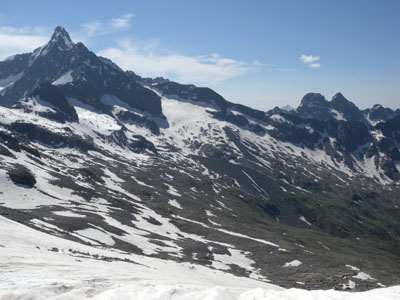 Queste due foto sono state scattate durante la salita alla Bocchetta Roma. A sinistra vediamo in primo piano la morena su cui è stato costruito il Bivacco Kima (2675 m), ben visibile nella foto: è un buon punto di sosta nella lunga traversata e, in caso di necessità, anche un ottimo riparo. Contro il cielo si distinguono la Cima Centrale di Chiareggio (3107 m), a destra e la Punta Baroni (3203 m), a sinistra. Nella foto a destra, al di sopra della cresta che scende dal Pizzo Torrone Orientale, si ammirano i Pizzi del Ferro, a sinistra, il Monte di Zocca, al centro. Sulla destra, al di là del confine, si vedono l'Ago di Sciora (3205 m) e la Pioda di Sciora (3328 m), con il suo caratteristico profilo sommitale. |
