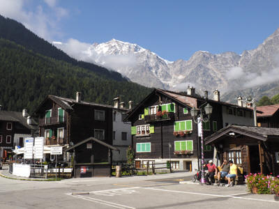 | A sinistra: uno scorcio della piazza del municipio di Macugnaga, a Staffa, punto di partenza della terza tappa. Sullo sfondo appare il gruppo del Monte Rosa, con la Punta Nordend (4609 m), a sinistra, e il Gran Fillar (3676 m), al centro. Nella foto a destra vediamo la Chiesa Vecchia di Macugnaga, che risale al tardo Medioevo (ma che ha subito diverse trasformazioni nei secoli successivi), e il Tiglio secolare (la cui età, a seconda delle fonti, è stimata tra i cinquecento e i settecento anni). Sulla destra si intravedono alcune case del Dorf. | |