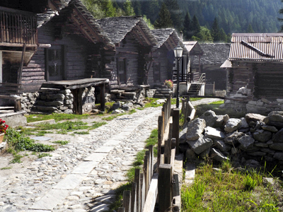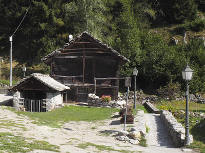 | A destra della Chiesa Vecchia, una breve digressione, porta a visitare il Dorf, l'antico borgo di Macugnaga, con le sue case walser. Nella foto a sinistra vediamo una bella casa e il forno comunitario; in quella a destra si vede un fienile. | |
