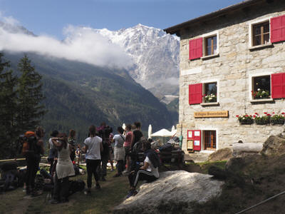| A sinistra: il Rifugio Scarteboden (1500 m c.a), affacciato sulla valle e sulla parete Est del Monte Rosa; a destra: ancora un tratto della bella mulattiera. | |