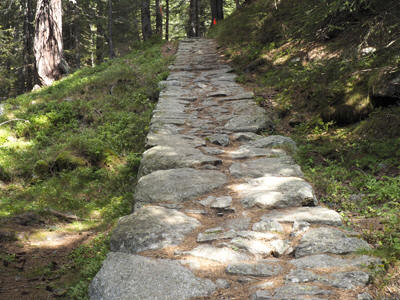 | A sinistra vediamo ancora alcune case del Dorf. A destra possiamo ammirare un tratto dell'antica mulattiera, ben conservata fino all'Alpe Bill. | |