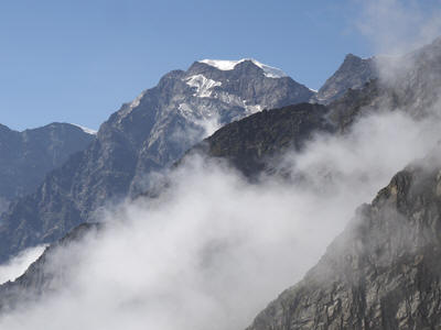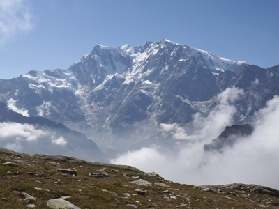 | A sinistra: la Cima di Jazzi (3803 m). A destra: tutto il gruppo del Monte Rosa, dalla Punta Grober (3497; a sinistra) alla Cima di Jazzi (a destra). Siamo ormai prossimi alla pietraia lungo la quale si svolge l'ultima parte della salita. | |
