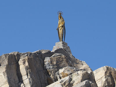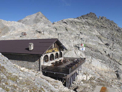 | A sinistra: il Rifugio Oberto-Maroli (2796 m) sullo sfondo dello Joderhorn (3034 m, a sinistra) e della Punta San Pietro (2905 m, a destra). Nella foto a destra vediamo la statua della Madonna delle Nevi collocata poco sopra il Passo di Monte Moro, a quota 2868 m. Opera dello scultore Giuseppe Banda, è in bronzo dorato ed è alta 4,60 metri. Fu collocata nel 1966 e il 5 agosto di quell'anno (festa della Madonna della Neve) fu benedetta dal vescovo di Novara (monsignor Vittorio Piola) e dal parroco di Macugnaga (don Sisto Bignani). | |