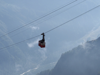| Nella foto a sinistra: la cabina della funivia sta per raggiungere la stazione di arrivo. In quella a destra: gli ultimi raggi del sole accarezzano la Punta Gnifetti mentre la parete Est del Monte Rosa è ormai tutta in ombra. | |