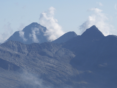 | A sinistra, guardando verso Sud si possono ammirare alcune cime "satelliti" del Monte Rosa: il Monte Tagliaferro (2964 m, a sinistra), il Corno Mud (2802 m, al centro) e il Corno Piglimò (2894 m, a destra). Nella foto a sinistra possiamo ammirare la Punta Gnifetti sulla quale svetta la Capanna Regina Margherita, il rifugio più alto delle Alpi. A sinistra, più bassa, si vede la Punta Parrot (4432 m). | |