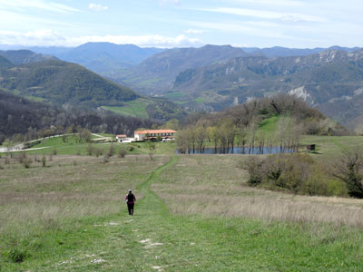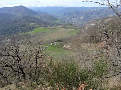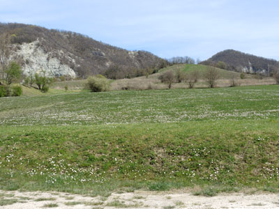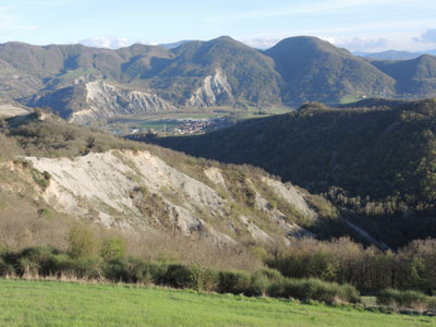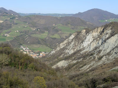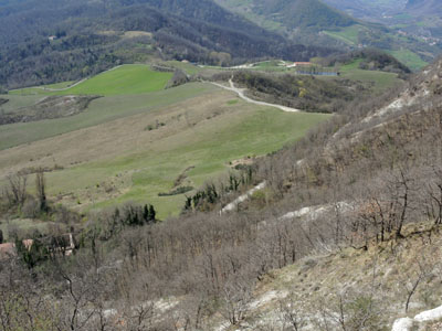 Percorrendo l'Itinerario del Memoriale, prima di arrivare a Caprara di sotto, guardando a sinistra (ONO) si possono notare gli interessanti fenomeni erosivi che caratterizzano il versante meridionale del Monte Castellino. Si vedono anche le case di Sibano (altra frazione di Marzabotto), dominate dalle montagne del versante sinistro idrografico della Valle del Fiume Reno (foto a sinistra). La foto a destra è stata scattata da un punto panoramico lungo la facile salita al Monte Caprara. In basso a sinistra si vedono i ruderi di Caprara di sotto, raggiunti dalla strada lungo la quale passa l'Itinerario del Memoriale. Più in alto si osserva l'ampia sella erbosa dove si trova la località San Martino. Più a destra si vede l'edificio del Centro Visite Il Poggiolo, punto di partenza dell'itinerario descritto nella relazione. |