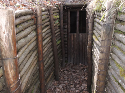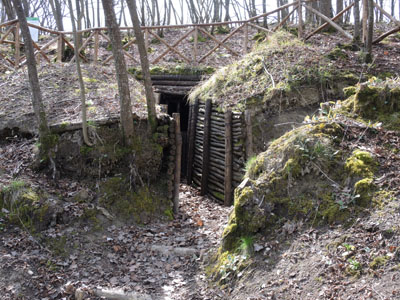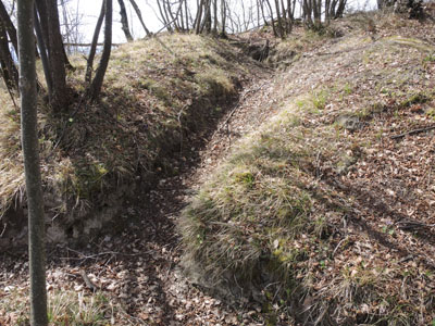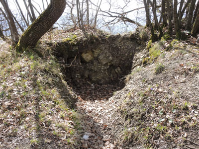 In cima al Monte Caprara sono stati riportati alla luce i resti delle opere del sistema difensivo creato dai tedeschi dopo l'eccidio di inizio ottobre 1944 per opporsi all'avanzata dell'esercito angloamericano. Qui vediamo ciò che rimane di alcune trincee usate dai soldati tedeschi per spostarsi dagli acquartieramenti al lato Sud della montagna (da cui potevano tenere sotto osservazione il territorio da cui provenivano gli Alleati). |