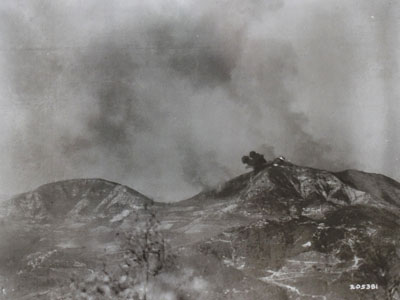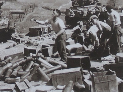 Dai pannelli illustrativi presenti sul posto ho ricavato queste due immagini relative alla battaglia combattuta in questa zona della "Linea Gotica" a metà di aprile 1945. Dopo un bombardamento di due giorni, le truppe della Sesta divisione sudafricana attaccano Monte Sole, Monte Caprara e Monte Abelle. L'inizio dell'operazione è fissato alle 22,30 del 15 aprile. Le prime avanguardie alleate giungono sulla cima del Monte Sole il 16 aprile all'una di notte; il Monte Caprara viene conquistato alle 7,45 dopo violenti combattimenti, anche all'arma bianca. In serata viene raggiunto anche il Monte Castellino. Nei giorni successivi verranno anche attaccate le ultime postazioni tedesche sul Monte Adone, più vicino a Bologna. Ancora qualche giorno e tutta l'Italia settentrionale sarà liberata dagli Alleati e dai partigiani (notizie ricavate dal sito "biblioteca.salaborsa.it"). Nella foto a sinistra vediamo un'immagine del pesante bombardamento del 15 aprile 1945, nel momento in cui gli ordigni colpiscono la cima del Monte Sole (il Monte Caprara è il rilievo a sinistra). Nella foto a destra vediamo alcuni sudafricani che caricano i bossoli dei proiettili il giorno dopo la battaglia). |