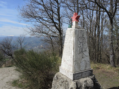 Ed eccoci sulla panoramica cima del Monte Sole dove si trova il cippo in ricordo della Brigata partigiana "Stella Rossa" e delle vittime dell'eccidio nazista (foto a sinistra). A destra vediamo uno scorcio dell'ampio visuale che si gode dalla cima: in basso, nel verde, si vedono i ruderi di Caprara di sopra, posti ai piedi del Monte Caprara (visibile in parte sulla destra della foto); più in alto si stende l'ampia sella erbosa dove si trova la località San Martino, dominata, in alto a sinistra dalla cima del Monte Salvaro (823 m). Sulla destra si stende la valle del Fiume Reno e contro il cielo si può ammirare la serie delle cime più alte dell'Appennino Modenese, dal Corno alle Scale (1945 m), al Libro Aperto (1937 m) fino al Cimone (2165 m), la cima più alta dell'Emilia-Romagna. |