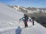 Questa bella montagna presenta due vie normali: una parte dalla Almagellerhütte, raggiunge lo Zwischbergenpass e arriva in cima percorrendo prima un ampio pendio nevoso e poi la cresta Sud-Est; l’altra sale dalla Weissmieshütte, percorre il Triftigletscher (sul versante Nord-Ovest) e raggiunge la cima lungo la cresta Sud-Ovest. Le due vie possono essere unite in una bellissima traversata di grande respiro, molto panoramica. In genere la traversata viene compiuta salendo dalla Almagellerhütte e scendendo alla Weissmieshütte: qui la propongo in senso opposto. In questo modo si riduce l’avvicinamento al rifugio (300 metri di dislivello dalla stazione della funivia di Kreuzboden alla Weissmieshütte) e si affrontano i crepacci e i seracchi del Triftigletscher nelle prime ore del mattino. In compenso bisogna arrampicare in discesa lungo la parte rocciosa della cresta Sud-Est e si devono affrontare i 2350 metri di dislivello della discesa fino a Saas-Almagell.